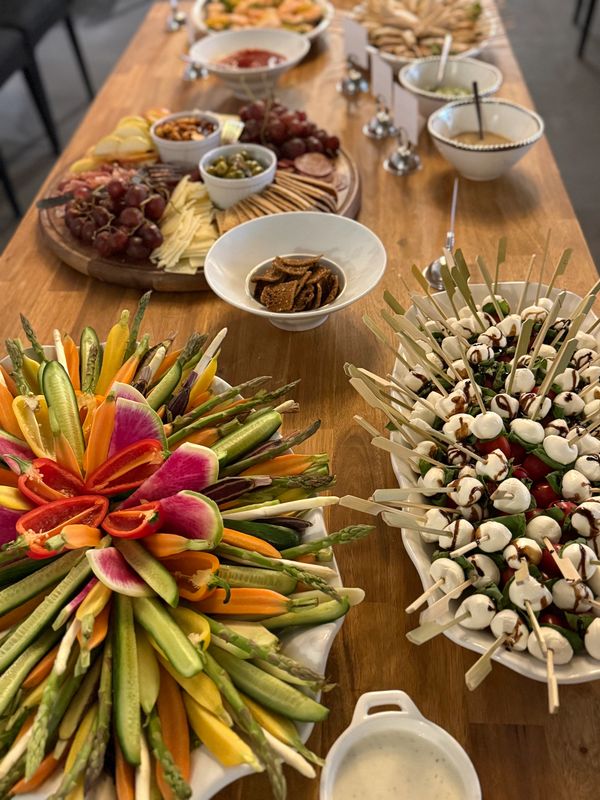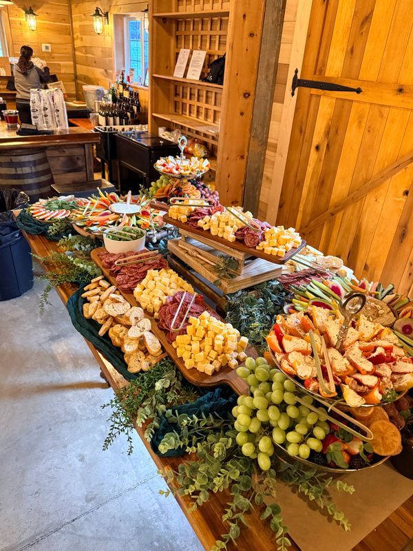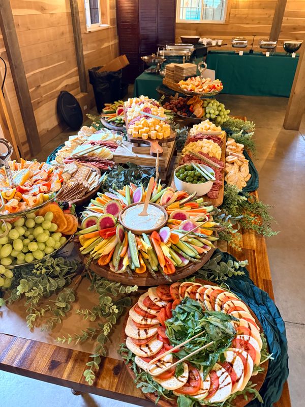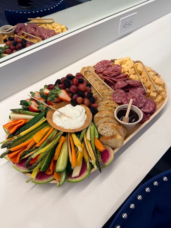 Imported Meats and Cheeses, Homemade Cheese Spreads, Fresh Veggies, Fresh Fruit, Toasted Nuts, Grilled Artichokes, Assorted Olives, Hot Honey, Whole Grain Mustard and assorted Breads